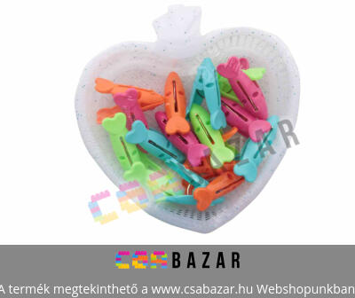 16 db-os színes ruhacsipesz műanyag szív alakú kosárban.